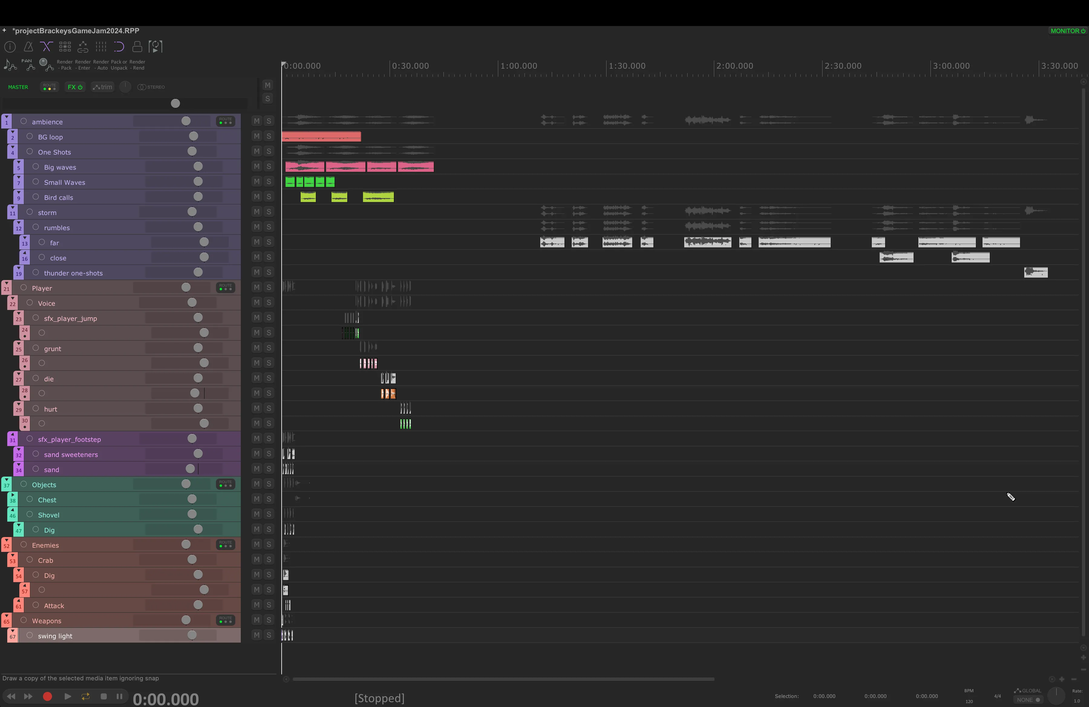 For the character, I recorded vocal samples for the different interactions. A day later I recorded sounds for the enemies; digging crabs with sharp claws.