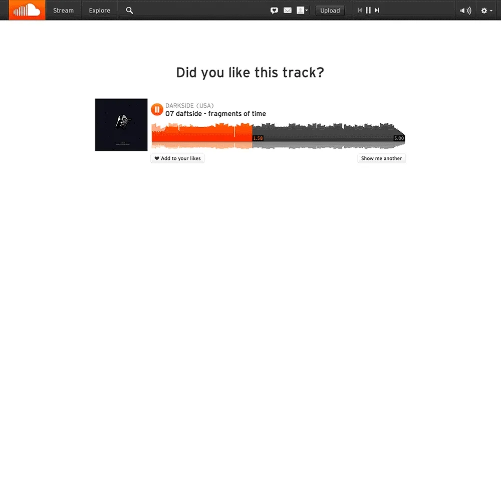 We decided to use our data to create a new version of the onboarding that hopefully created better retention. I was responsible for the concept, design and front-end for this project, working closely with my product manager and colleagues from the design team. We set out to offer a personalised experience based upon the user’s recent listening history, and familiarise the users with the concept of liking a track. This would also feed SoundCloud’s recommendation engine with more data.