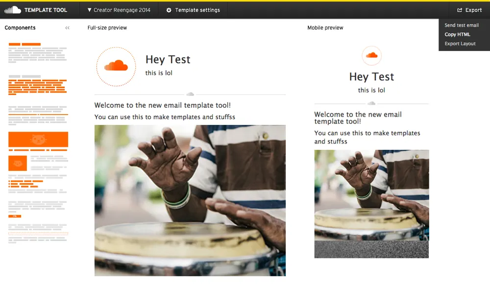 Users of the tool can add and move around individual elements of the email. The tool can export HTML, send test emails, or export a representation of the layout for in our email system. The components can be easily edited by the maintainers of the tool by updating the HTML and data files for each component.
